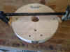 On the BOTTOM ONLY, begin adding the screening at the cut in the wood. You want the short edge of the screen hanging over the edge of the guard. Take the FOLDED edge of the screen and start by laying it on the bottom. Leave an inch or two long so that it hangs beyond the split in the disk as shown (don't want any openings for a snake to get thru).